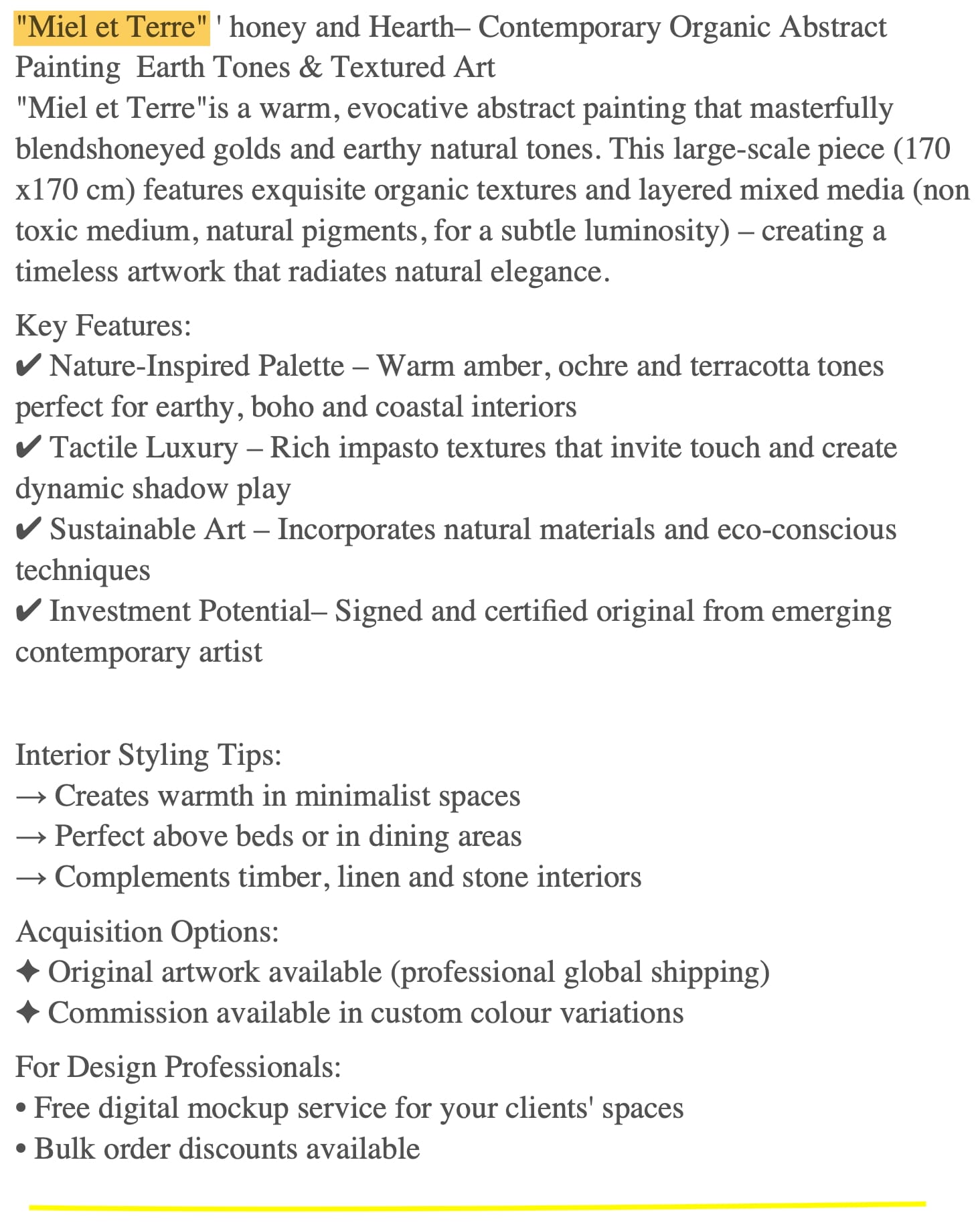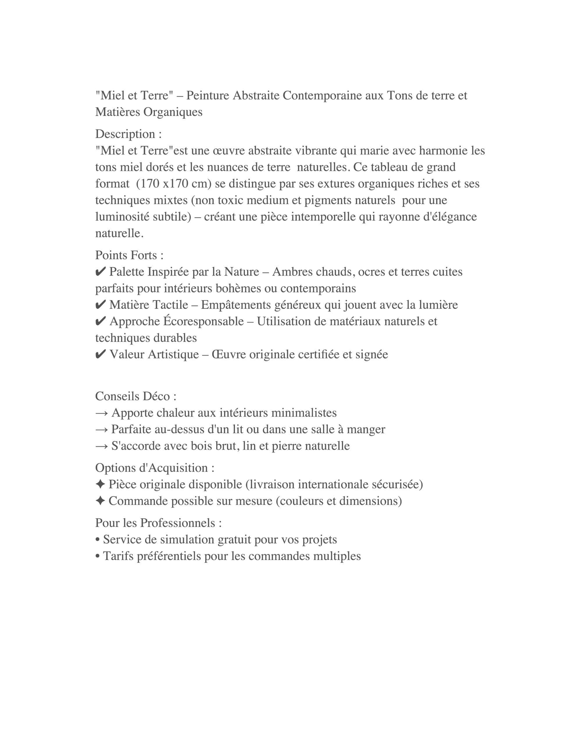 Miel et Terre Leave a Comment / By artjb8.com / 30/05/2024 “Miel et Terre” 170 x 170 x 3 cmMiel et Terresignature miel et terre